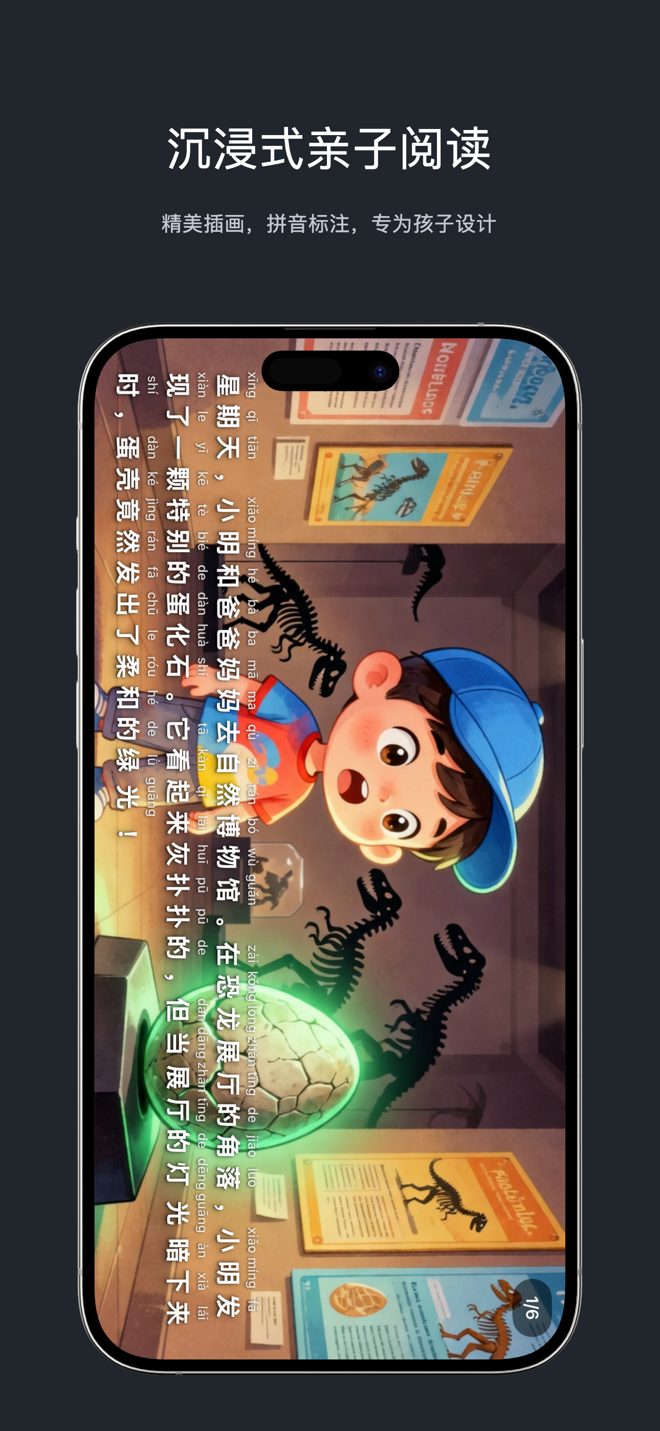 故事附带拼音注音,边读故事边认字,寓教于乐。 Stories include phonetic guides to help children learn characters while reading.
